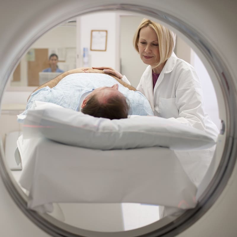 Doctor Talking To Patient On MRI Scanner In Hospital